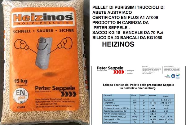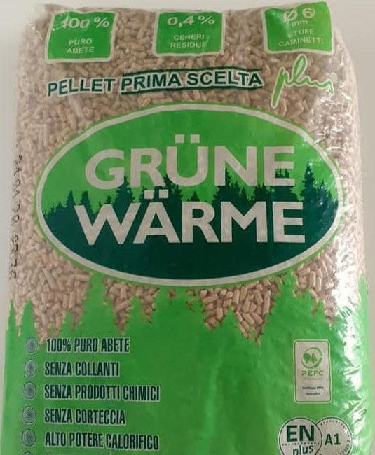 Pellet Grune Warme 100% abete bianco: potere calorifico kwh/kg. 5,2 – umidità 6% – ceneri 0,4%, bancale da 70 sacchi. Prezzo € 6,25.